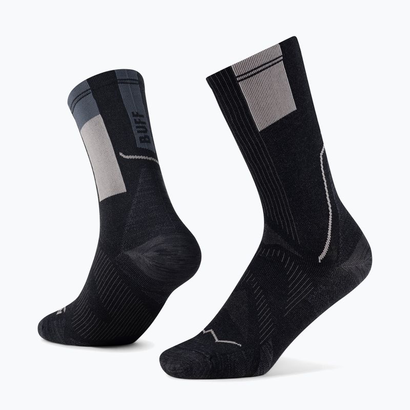 BUFF Coolnet Crew fekete zokni kiváló választás futók számára, akik megbízható és kényelmes kiegészítőket keresnek sportos ruhatárukhoz. A poliamid, elasztán és újrahasznosított poliészter anyagok alkalmazásának köszönhetően ezek a zoknik kivételes légáteresztő képességet és hatékony nedvességelvezetést biztosítanak a bőr felszínéről. A mid magasság optimális fedést nyújt, amely támogatja a dörzsölődések és irritációk elleni védelmet intenzív terhelés közben.