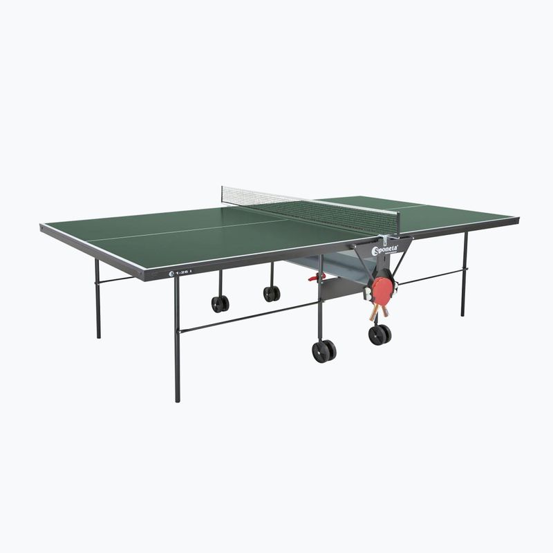 A zöld Sponeta S1-26i asztal teniszhez praktikus szállító kerekekkel van felszerelve, ami megkönnyíti a mozgatását és tárolását. A Click összecsukható rendszernek köszönhetően könnyen összeszerelhető, ami helymegtakarítást tesz lehetővé. A Single Player lehetőség lehetővé teszi a szóló játékot, ami tökéletes megoldás a készségek edzésére. Ezen kívül az asztal rendelkezik labda- és ütőzsebekkel, amelyek segítenek rendben tartani és kényelmesen tárolni a kiegészítőket.
