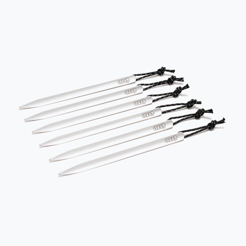 A ENO Tarp Stake 6 db könnyű és tartós elemek a tarpa vagy a sátor rögzítéséhez. Az alumínium szerkezet jól tartja magát a talajon, és a fényvisszaverő kötelek megkönnyítik a megtalálásukat és használatukat sötétben.